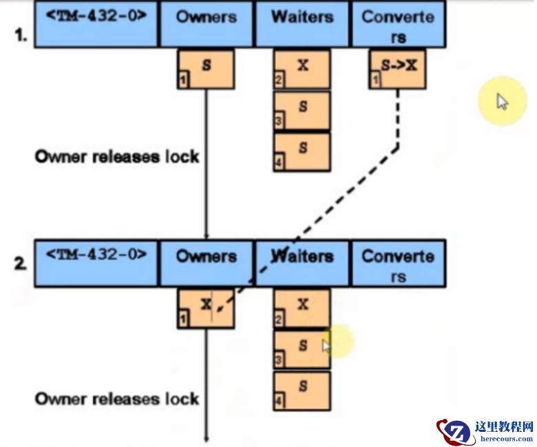 S1 释放 S 锁:系统先扫描 Converters 队列,发现 S1 要升级,于是 S1 立马获得 X 锁,进入 Owners 队列。