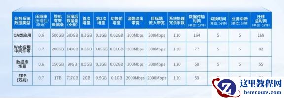 根据迁移传输的网络带宽情况,评估对业务网络的影响,并计算和安排整体迁移工作的时间。下表以部分系统迁移为例: