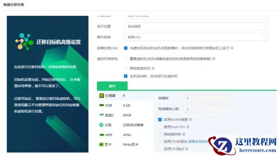 3 在新建迁移任务的过程可同时选择迁移后目标端虚拟机的详细配置, 如需对迁移后的虚拟机进行配置修改、策略修改、高级特性配置,皆可在迁移之前完成,配置完成后自动在目标端生效, 无需在业务停机切换过程中消耗时间,可以在一定程度上缩短业务停机窗口。