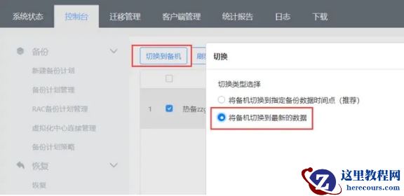 5 来到业务切换窗口期或业务低峰期,进入热备切换过程。找到相应的热备计划对其进行切换,切换时选择将备机切换到最新的数据。切换过程中自动修改源端网络配置,将业务切换到目标端。