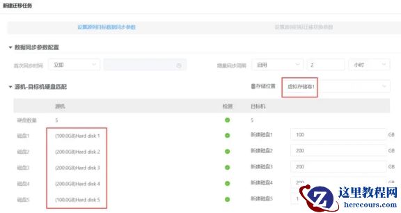2 对接完成后,在SCMT选择待迁移的虚拟机,创建点对点迁移任务。此步骤选择对源虚拟机CPU/内存/磁盘/网卡等资源进行迁移, 允许在迁移过程中对资源大小、类型、配置进行修改,允许根据网络状况配置数据同步频率和传输带宽限制等内容。