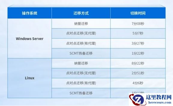 停机中断时间: 热备迁移方式通过CDP数据传输,半开机状态同步等技术提高数据传输频率,加快数据同步效率,缩短目标端开机时间,将业务切换过程中的停机时间控制在1分钟左右(具体中断时间和业务服务启动时间有关),满足对可靠性较高的业务系统迁移需求。