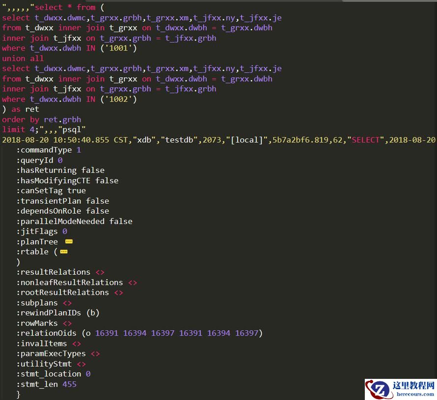 commandType值为1,对应的是SELECT,SQL语句长度为455,relationOids的值为(o 16391 16394 16397 16391 16394 16397),分别对应t_dwxx/t_grxx/t_jfxx三张表.