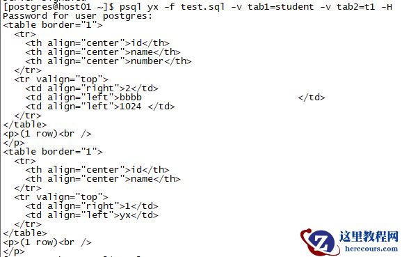 [postgres@host01 ~]$ psql yx -f test.sql -v tab1=student -v tab2=t1 id | name | number----+----------------------------------+-------- 2 | bbbb | 1024(1 row) id | name----+------ 1 | yx(1 row)