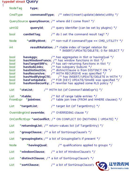经过语义检查,会将SelectStmt变形为Query结构,作为查询重写的输入。Query结构包含的部分与SelectStmt类似,只不过内容更加丰富: