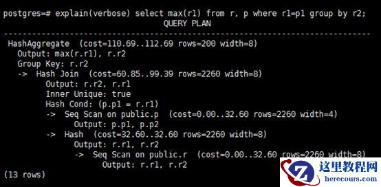 完成这些这些步骤后,调用set_plan_references()以及SS_finalize_plan()函数最后处理参数和变量引用后,就可以输出最终的查询计划(Execution Query Plan)了。查询计划由很多节点组成:投影、扫描、连接、Aggregate、GROUP BY、排序等,从这些名称也可以看出他们就是关系代数的操作符,它们会被传给查询执行组件进行执行。如下查询计划示例: