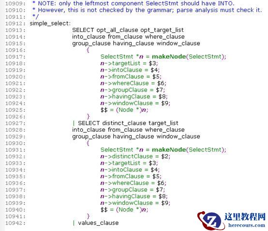在PostgreSQL中,pg_parse_query是语法分析的入口函数,实际上由scan.l(Flex文件)以及gram.y(Bison文件)完成语法检查。