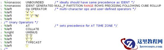 scan.l是词法分析,将输入SQL分解一个个的Token,输入到gram.y中进行规则匹配。gram.y中定义了所有SQL类型的语法规则以及操作符的优先级和结合律,例如,下段代码定义了操作符的优先级和结合规则:
