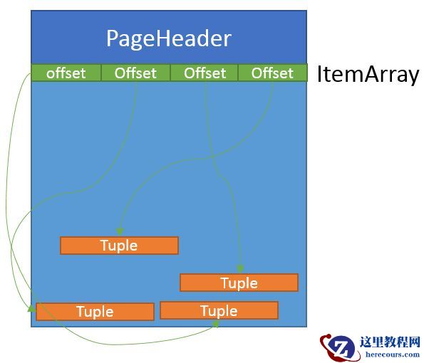 PostgreSQL页面存储与大多数数据库的类似,包含:页面头,ItemId 数组,以及Item(元组),布局如下: