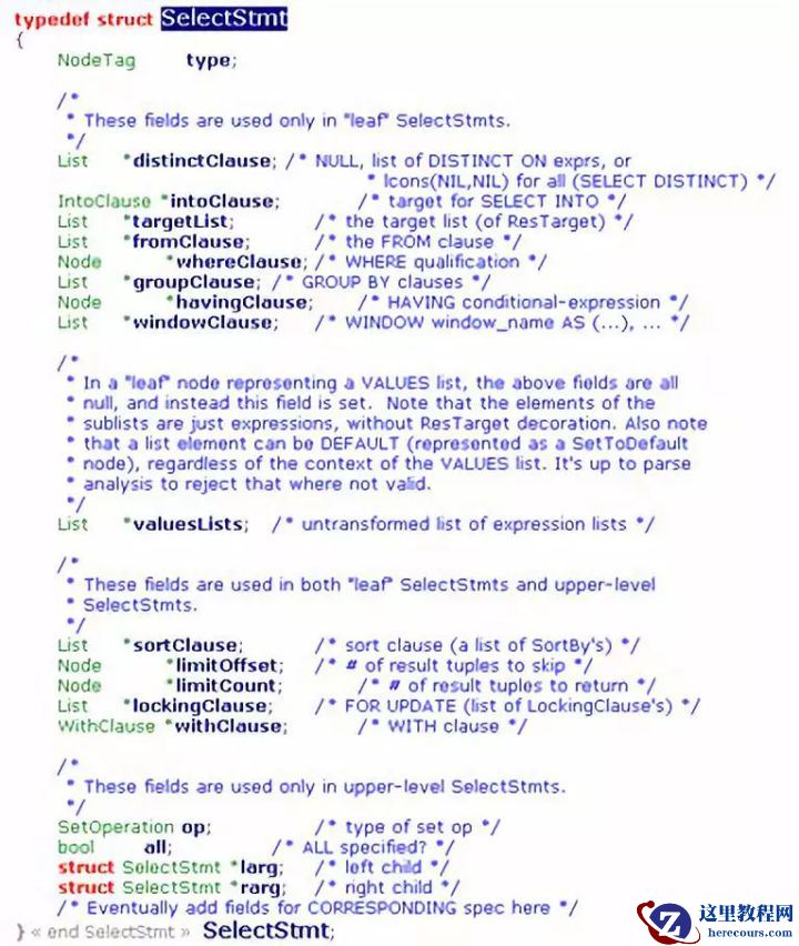 语法分析结束后,以查询(SELECT)为例,返回的结构体是SelectStmt,它会作为作为语义分析模块的输入。SelectStmt保存了SQL语句中的各个语法子部分,例如:from子句,投影列,group子句等,从其定义可以看出更多细节: