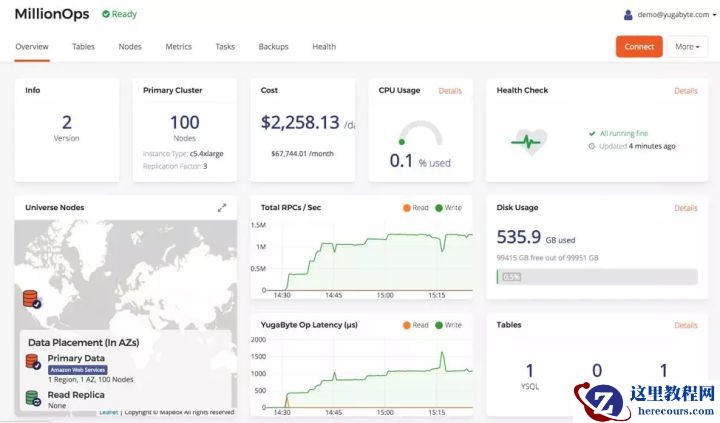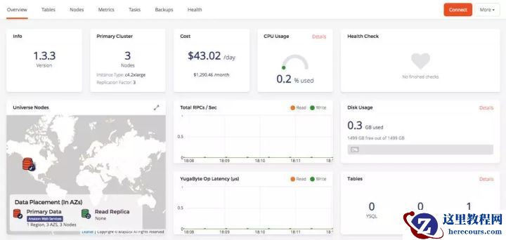 以下所有基准测试都是在AWS云的俄勒冈区进行的。YugabyteDB 2.0部署在一个跨多可用区的类型为i3.4xlarge的三节点群集上(每个节点上有16个vCPU)。整个部署架构可以显示为下面的UI屏幕截图。