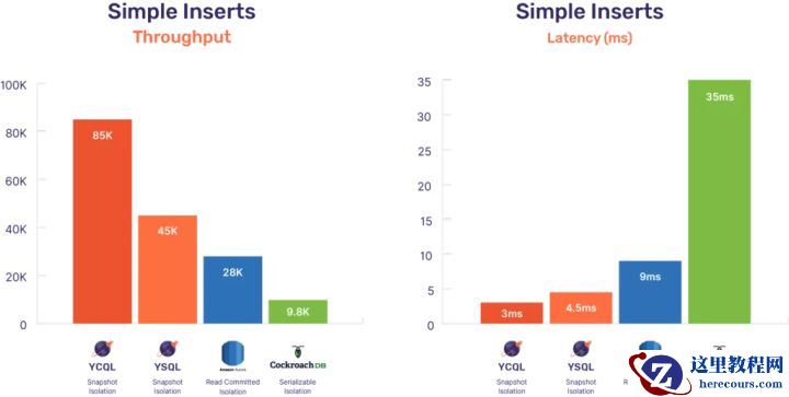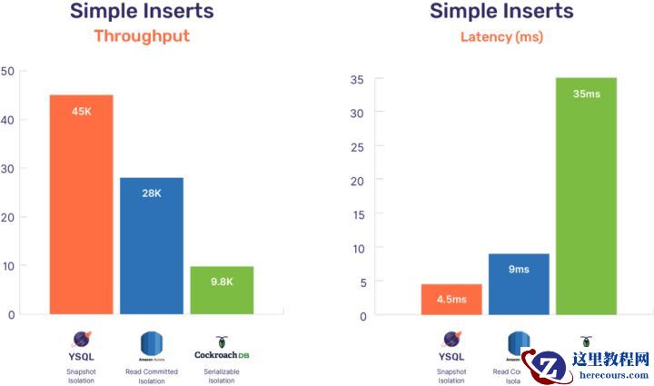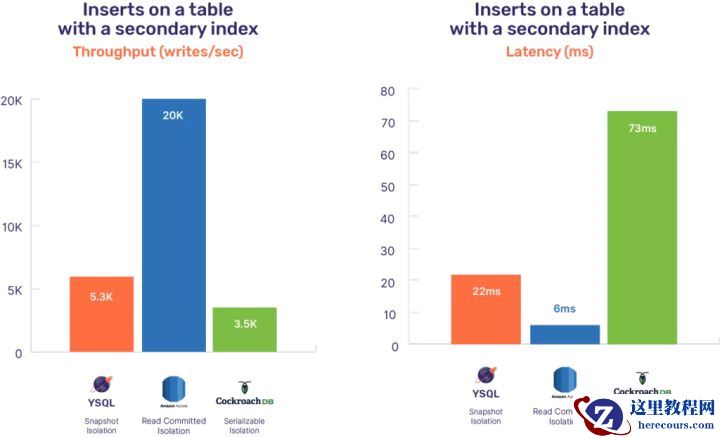 请注意,CockroachDB仅支持串行化隔离,而YugabyteDB和Amazon Aurora同时支持串行化和快照隔离。Amazon Aurora甚至支持较低的提交读隔离级别,这也是它的默认设置。这篇文章中的基准测试使用所有数据库中的默认设置,对于只有简单插入和非聚集索的程序来说,这些默认设置足以保证正确性。