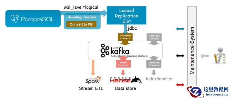 解析WAL成为逻辑数据的过程被称为Logical Decoding,是从PostgreSQL 9.4开始引入的特性。Logical Decoding是把WAL日志解析成逻辑日志的过程,将用户定阅的数据变化(即对某些表的insert/update/delete操作来带的数据变化)输出成特定的数据格式,Debezium支持Logical Decoding plugin有decoderbufs、wal2json、pgoutput(PostgreSQL 10以上版本)。