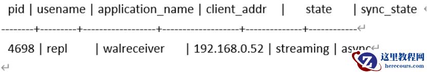 在主库上查询,如下,可以看到,sync_state,async就表示异步流复制。