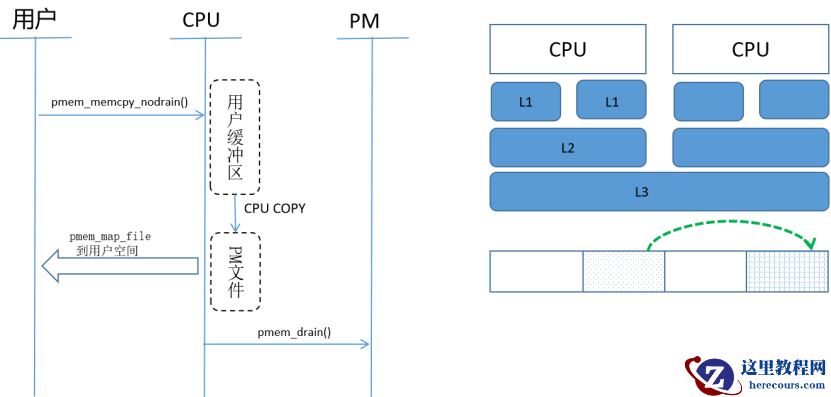 libpmem 库主要特性是提供一种将脏数据刷写到持久内存的方法。常用的函数主要包括 pmem_flush 、pmem_drain 、 pmem_memcpy_nodrain 。由于CPU CACHE 内容向 PM 刷写的时机和顺序不受用户控制,所以需要特定指令进行强制刷写。 pmem_flush 的功能为调用 CLWB 、 CLFLUSHOPT 或 CLFLUSH 指令强制将 CPU CACHE 中内容(以 cache line 为单位)刷写到 PM ;指令发起后,由于 CPU 是多核, cache 中内容到 PM 的顺序也不一样,所以还需要 pmem_drain 即调用 SFENCE 指令,确保 CLWBs 全部执行完成。如果 pmem_flush 调用的指令是 CLFLUSH ,则该指令中包含 sfence ,所以理论上不再需要调用 pmem_drain ,实际上如果是这个指令的话, pmem_drain 什么也不做。 上述讲述了CPU cache 内容向 PM 刷写的函数。下面讲述内存拷贝,即从内存向 PM 拷贝数据。该功能由 pmem_memcpy_nodrain 完成,调用 MOVNT 指令( MOV 或 MOVNTDQ ),该指令拷贝不经过 CPU CACHE ,所以这个功能不需要 flush 。但是需要在结束的时候建立 sfence 确保所有数据都已经拷贝到 PM 。