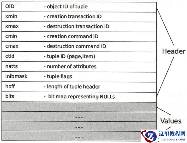 每个 Tuple 包含两部分的内容,一部分为 HeapTupleHeader,用来保存 Tuple 的元信息,包含该 Tuple 的 OID、xmin、cmin 等;另一部分为 HeapTuple,用来保存 Tuple 的数据。