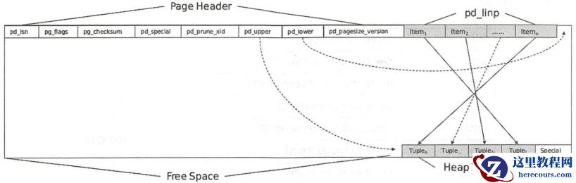 Free Space 段:The unallocated space. New item pointers are allocated from the start of this area, new items from the end.
