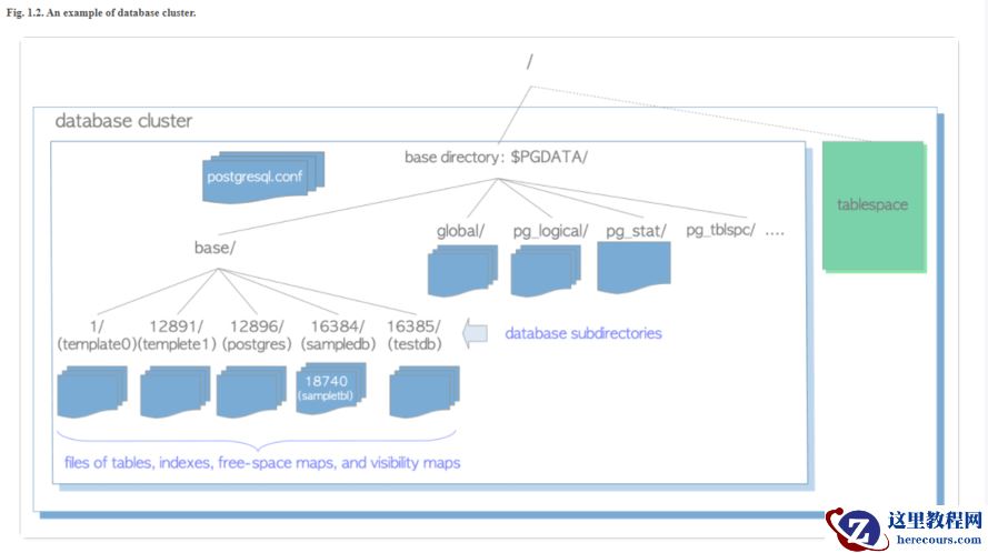 initdb utility to initialize a new database cluster, a base directory will be created under the specified directory. Though it is not compulsory, the path of the base directory is usually set to the environment variable PGDATA.Figure 1.2 shows an example of database cluster in PostgreSQL. A database is a subdirectory under the base subdirectory, and each of the tables and indexes is (at least) one file stored under the subdirectory of the database to which it belongs. Also there are several subdirectories containing particular data, and configuration files. While PostgreSQL supports tablespaces, the meaning of the term is different from other RDBMS. A tablespace in PostgreSQL is one directory that contains some data outside of the base directory.
