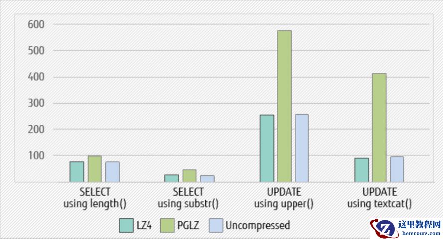 F igure 5 - Comparing SELECT performance with 16 clients 同样也比较了使用字符串函数的SELECT、UPDATE处理文本的速度。整个场景下LZ4优于PGLZ。LZ4压缩算法的数据与未压缩数据相比,函数处理的速度几乎一样,LZ4算法几乎不会影响字符串操作速度。