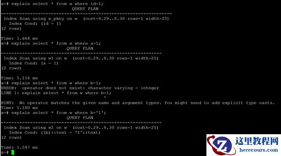 可以看出写入1万条数据也就0.8秒左右。这是一个普通的虚拟机。环境很普通。这个性能不错了。所以大家只要是正常使用数据库现如今的数据库单机就能满足绝大多数应用。甚至不少NoSQL和消息队列等都不需要就可以满足。甚至我觉得大部分公司都不具备大数据场景。即使具备,类似Oracle、PostgreSQL也能处理。来看一下执行计划。id=1如下图。和预期一样。a=1也和预期一样。b=1这里就不一样了。直接报错。说类型不对等。