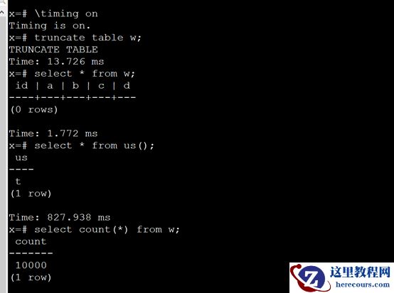 写个存储过程补1万数据进去。create or replace function us() returnsboolean AS$BODY$declare i integer; begin i:=1; FOR i IN 1..10000 LOOP INSERT INTO w (id,a,b,c,d) VALUES (i,i,i,i,now()); end loop; return true; end;$BODY$LANGUAGE plpgsql;