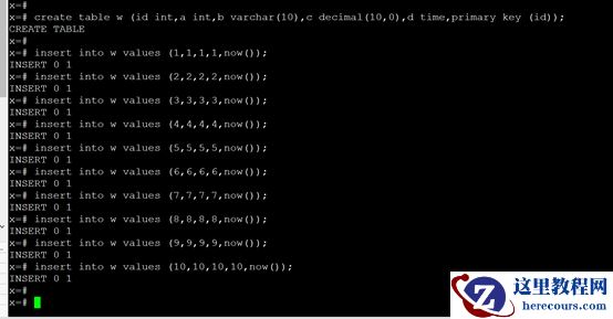 x=# \d List of relations Schema | Name | Type | Owner --------+------+-------+---------- public | a | table | postgres(1 row) x=# create table w (id int,a int,b varchar(10),c decimal(10,0),d date,primary key (id)); CREATE TABLEx=# insert into w values (1,1,1,1,now());x=# insert into w values (2,2,2,2,now());x=# insert into w values (3,3,3,3,now());x=# insert into w values (4,4,4,4,now());x=# insert into w values (5,5,5,5,now());x=# insert into w values (6,6,6,6,now());x=# insert into w values (7,7,7,7,now());x=# insert into w values (8,8,8,8,now());x=# insert into w values (9,9,9,9,now());x=# insert into w values (10,10,10,10,now());如图。