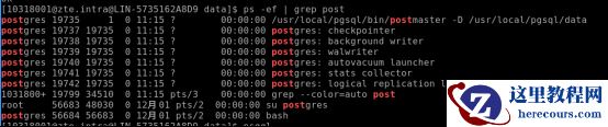 使用命令 #service postgresql start (需要 root 权限) , 启动数据库服务。可以通过命令: $sudo ps -ef | grep postgres ,查看 postgres 相关进程,如下图所示: