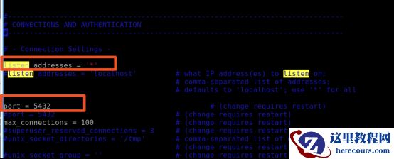 然后,使用命令 vim postgresql.conf, 配置数据库参数(设置服务器监听整个网络,设置端口号为 5432 )。如下图所示: