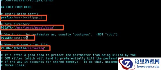 然后执行 vim /etc/init.d/postgresql ,查看配置信息是否如下图所示,若不同,请按下面的方式配置: