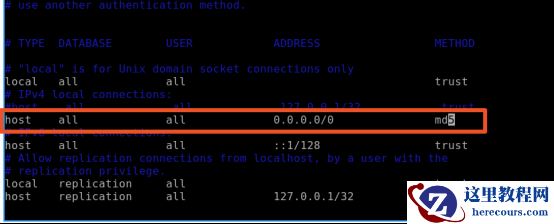 首先,进入 /usr/local/pgsql/data 目录,使用命令 vim pg_hba.conf, 配置对数据库的访问控制(设置为可以通过密码访问)。如下图所示: