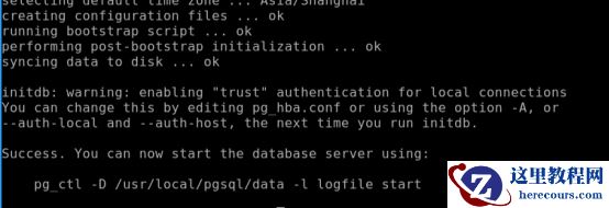 图中红框中文字所示,由于之前在配置文件中已经设定了环境变量 PGDATA ,因此可以直接使用命令 initdb 来完成数据库初始化操作。