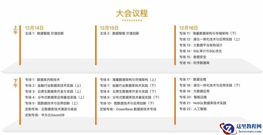 大会从12月14日至12月16日,共计三天。12月14日、12月15日两天上午为主论坛,其余时间设置20+技术专场,邀请超百位行业专家,重点围绕时序数据库、图数据技术、实时数仓技术与应用实践、云原生数据库、大数据平台与数据安全等内容展开分享和探讨。