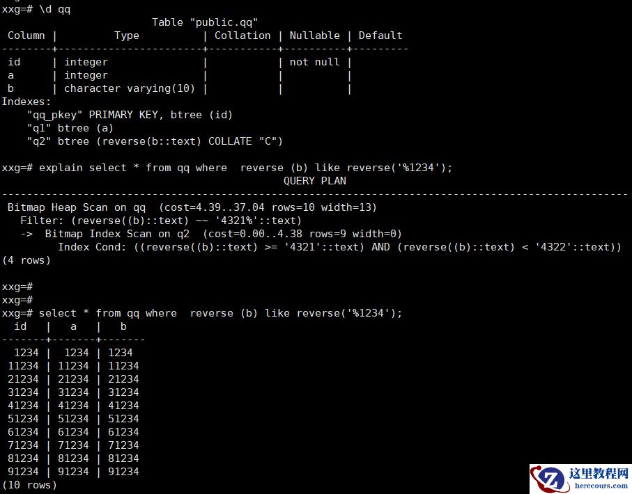 重点是建立一个反向索引。 create index q2 on qq ( reverse(b) collate "C"); 这里开始建立不顺,和几位PG大佬交流了一下。这里的写法和Oracle有所不同。多了collate "C"