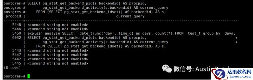 SELECT pg_stat_get_backend_pid(s.backendid) AS procpid, pg_stat_get_backend_activity(s.backendid) AS current_queryFROM (SELECT pg_stat_get_backend_idset() AS backendid) AS s;