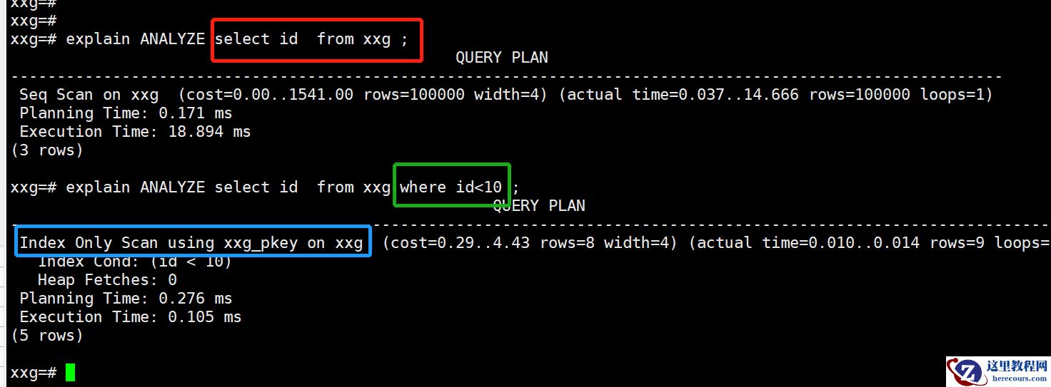 只有到了使用where条件以后的,select id,才出现了期望得到的仅使用索引的 index only scan的效果。(这里我是和灿灿问了一下,确定了和我最初想法不一样)这个是类似MySQL索引覆盖的效果。