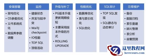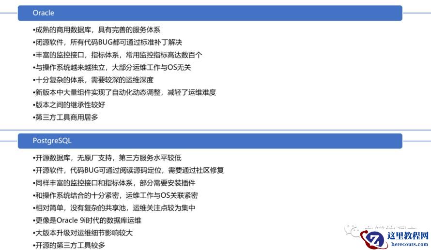 如果按照上面的维度把Oracle数据库与PG数据库的运维做个比对。PG是开源数据库,无原厂支持,第三方服务水平较低,,代码BUG可通过阅读源码定位,需要通过社区修复。在这里,第三方服务厂商就可以为客户提供很多服务,比如数据库的安装和初步调优,以及定期的补丁与安全漏洞检查,打补丁升级,解决日常遇到的BUG等。与拥有原厂标准化补丁和服务的Oracle相比,PG数据库这方面相对较弱,需要第三方服务来加以支持。对于运维监控与优化而言,PG数据库提供了同样丰富的监控接口和指标体系,不过部分监控接口需要安装插件,包括一些十分重要的监控采集内容,比如TOP SQL,都需要安装插件来实现。PG的第三方服务商应该帮助用户提供这方面的安装部署服务。另外一方面,PG数据库和操作系统结合得十分紧密,运维工作与OS关联紧密,相对简单,没有复杂的共享池,运维关注点较为集中。在我个人的感觉里,PG数据库的运维更像是Oracle 9i时代的数据库运维。与Oracle数据库不同的是,PG数据库的大版本升级对运维细节影响较大,甚至很多运维细节都是颠覆性的。因此需要PG的运维人员不断地更新版本信息,否则很容易出现认知错误。最后一方面,PG开源的第三方工具和第三方生态产品较多,而且这些工具与Oracle的第三方工具、生态产品不同,如果不能很好地掌握这些工具和生态产品,会对PG数据库的运维产生比较大的影响。如果你去运维Oracle数据库,那么只要把Oracle自身玩好就行了,Oracle数据库自身构成了一个十分完善的体系,周边工具与Oracle RDBMS之间是紧密集成,而且从底层是贯通的。而PG数据库则不同,PG社区仅仅提供了一个RDBMS和一些必要的外围工具,剩下的应用所需要的功能都是其他的开源项目提供的。因此PG周边的生态工具数量庞大,功能也存在差异,与PG数据库的集成也是应用级的,没有在RDBMS底层进行打通。最大的问题是用户在选择这些产品的时候也比较随意,你去服务的不同客户可能会选择不同的高可用解决方案,选用不同的读写分离集群方案,使用不同的第三方插件来解决一些数据库的功能问题。因此作为PG数据库的DBA或者运维服务人员,你需要全面地掌握这些第三方生态工具,才能够真正把PG数据库的运维服务做好。在PG数据库的运维中,从一个ORACLE DBA的角度,我也总结了一些日常运维与优化的工作内容。因为今天下午我还要赶到东莞去参加华为的鲲鹏昇腾开发者峰会,所以今早的事情比较多,我就不展开介绍了,如果大家有兴趣,明后天我会把上面这个片子详细地介绍一下。大家有兴趣的话,就在下面留言吧。关于留言,我简单说几句,因为怕麻烦,我没有开启留言讨论的公众浏览功能,因此你们给我的留言我都是可以看见的,不过其他朋友可能看不见。年纪大了,只想静静地写点东西,没有精力去就某些观点争论与辩论,大家请包涵。