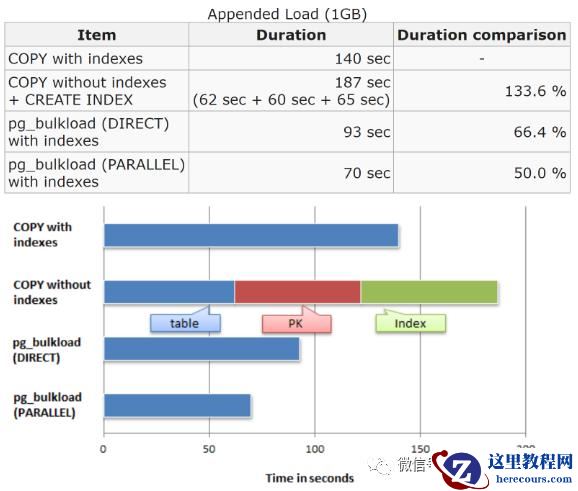 这里找到pg_bulkload 自己的压力测试图,在这里标称的结果与上面的测试结果类似。