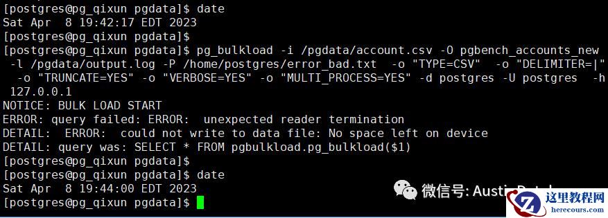 pg_bulkload -i /pgdata/account.csv -O pgbench_accounts_new -l /pgdata/output.log -P /home/postgres/error_bad.txt -o "TYPE=CSV" -o "DELIMITER=|" -d postgres -U postgres -h 127.0.0.1