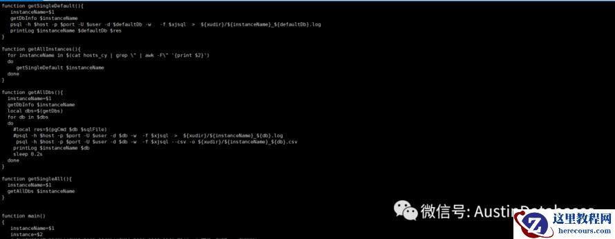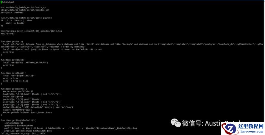 —————————————————————————————— #!/bin/bash hosts=/data/pg_batch_script/hosts_cy xjsql=/data/pg_batch_script/pgindex.sql dt=$(date '+%Y%m%d') xudir=/data/pg_batch_script/${dt}_pgindex if [ ! -d $xudir ]; then mkdir -p $xudir fi log=/data/pg_batch_script/${dt}_pgindex/${dt}.log #sqlFile=$3 function getDbs(){ local res=$(echo $sql |psql -h $host -p $port -U $user -d $defaultDb -At -v -w) echo $res } function getTime(){ local res=$(date '+%Y%m%d_%H:%M:%S') echo $res } function printLog(){ local res="$(getTime)\t$*" echo -e $res echo -e $res >> $log } function getDbInfo(){ #echo enter getDbInfo:$1 host=$(jq ".${1}.host" $hosts | sed 's/\"//g') #echo host:$host port=$(jq ".${1}.port" $hosts) user=$(jq ".${1}.user" $hosts | sed 's/\"//g') pass=$(jq ".${1}.pass" $hosts | sed 's/\"//g') defaultDb=$(jq ".${1}.defaultdb" $hosts | sed 's/\"//g') export PGPASSWORD=$pass #echo getDbInfo:$host,$port,$user,$pass } function getSingleDefault(){ instanceName=$1 getDbInfo $instanceName psql -h $host -p $port -U $user -d $defaultDb -w -f $xjsql > ${xudir}/${instanceName}_${defaultDb}.log printLog $instanceName $defaultDb $res } function getAllInstances(){ function getDbs(){ local sql="select datname from pg_database where datname not like 'test%' and datname not like 'backup%' and datname not in ('template0','template1','template2','postgres','template_db','cy7SaasCenter','cy7SaasCenterTest','cy7server','tcposroot','rdsadmin') order by datname;" local res=$(echo $sql |psql -h $host -p $port -U $user -d $defaultDb -At -v -w) echo $res } function getTime(){ local res=$(date '+%Y%m%d_%H:%M:%S') echo $res } function printLog(){ local res="$(getTime)\t$*" echo -e $res echo -e $res >> $log } function getDbInfo(){ #echo enter getDbInfo:$1 host=$(jq ".${1}.host" $hosts | sed 's/\"//g') #echo host:$host port=$(jq ".${1}.port" $hosts) user=$(jq ".${1}.user" $hosts | sed 's/\"//g') pass=$(jq ".${1}.pass" $hosts | sed 's/\"//g') defaultDb=$(jq ".${1}.defaultdb" $hosts | sed 's/\"//g') export PGPASSWORD=$pass #echo getDbInfo:$host,$port,$user,$pass } function getSingleDefault(){ instanceName=$1 getDbInfo $instanceName psql -h $host -p $port -U $user -d $defaultDb -w -f $xjsql > ${xudir}/${instanceName}_${defaultDb}.log printLog $instanceName $defaultDb $res } function getAllDbs(){ instanceName=$1 getDbInfo $instanceName local dbs=$(getDbs) for db in $dbs do