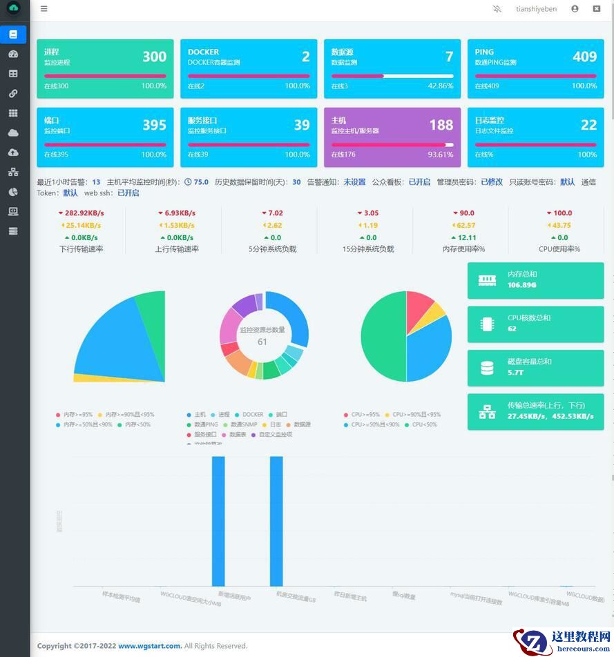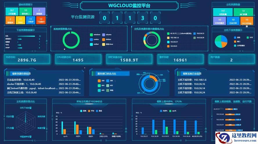 支持主机各种指标监测(cpu使用率,cpu温度,内存使用率,磁盘空间容量,磁盘IO,硬盘SMART健康状态,系统负载,连接数量,网卡流量,硬件系统信息等)。支持监测服务器上的进程应用、文件、端口、日志、DOCKER容器、数据库、数据表等资源。支持监测服务接口API、数通设备(如交换机、路由器、打印机)PING和SNMP监测、自定义监控指令等。自动生成网络拓扑图,大屏可视化,web SSH,统计分析报表,指令下发批量执行,FTP监测,资产管理,故障告警信息推送(如邮件、钉钉、微信、短信等)
