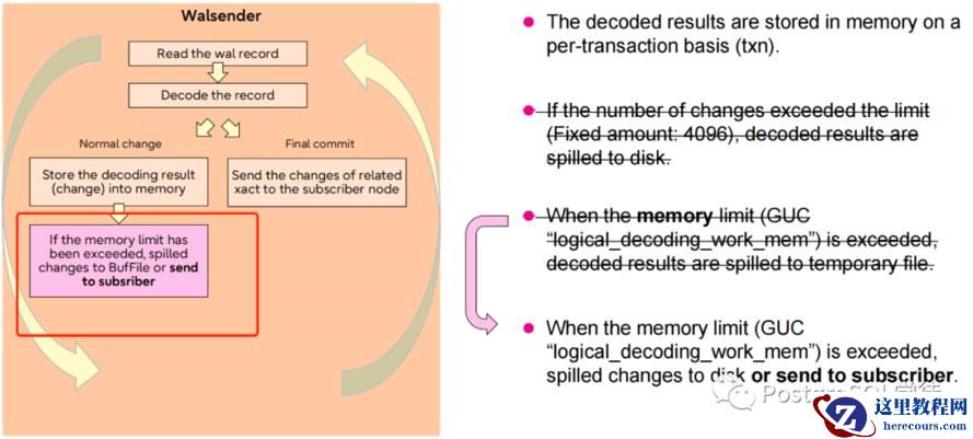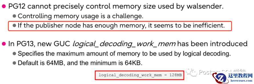 在 13 版本以后,引入了一个新的 GUC 参数:logical_decoding_work_mem