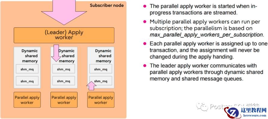 但是 13、14、15 三个大版本还是没有解决延迟的问题,只有在事务提交的时候,订阅端才可以进行回放,依旧会导致延迟。天空中最乌黑的那朵乌云依旧飘着,所以在 16 的版本里,又引入了并行回放——顾名思义,多个进程同时回放(要是 startup 也能多进程就好了)