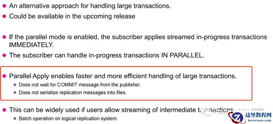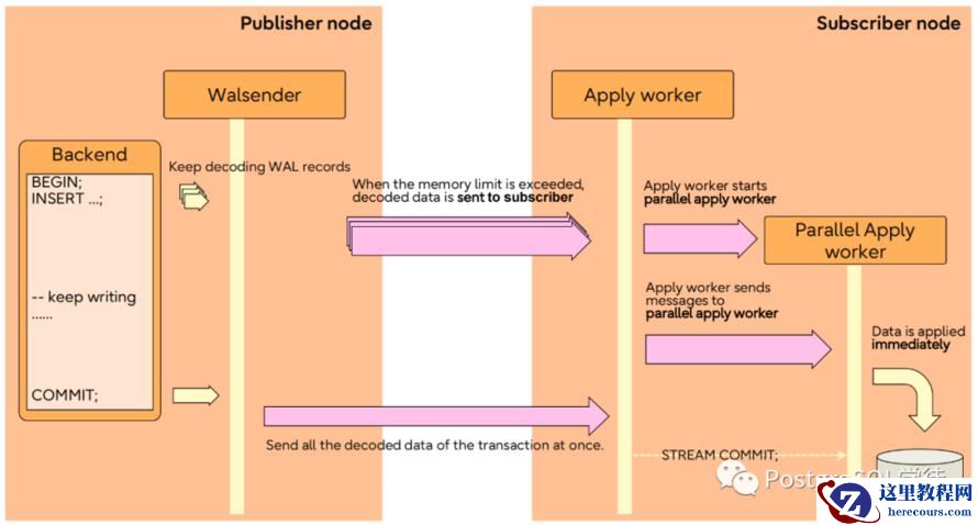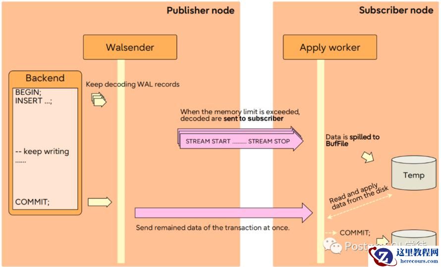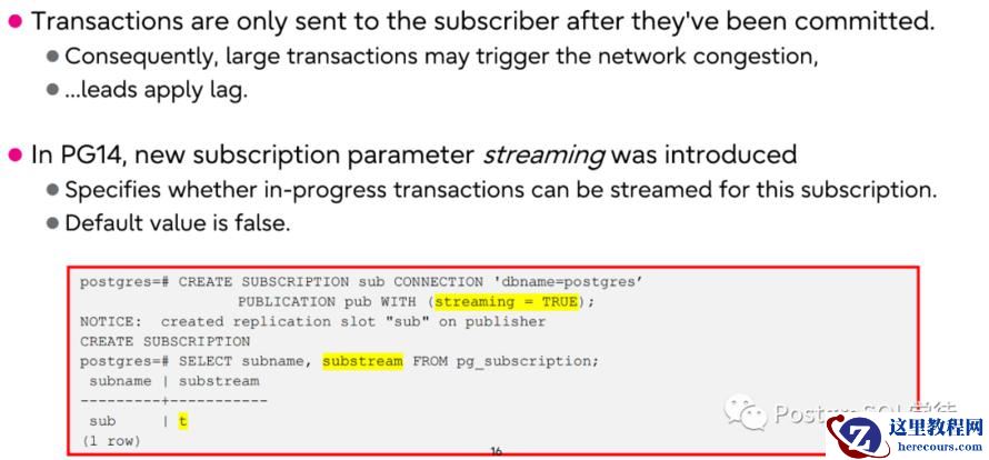 然后在 14 正式引入了"流式"传输,即未提交的事务也会流式传输到订阅端