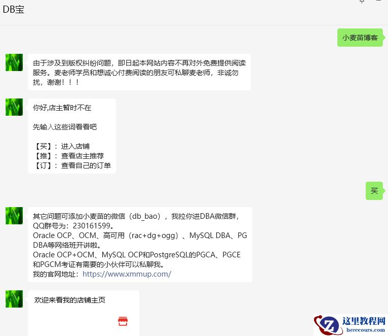 - 麦老师提供Oracle(OCP、OCM)、MySQL(OCP)、PostgreSQL(PGCA、PGCE、PGCM)等数据库的培训和考证业务,私聊QQ646634621或微信db_bao,非诚勿扰,谢谢!!!