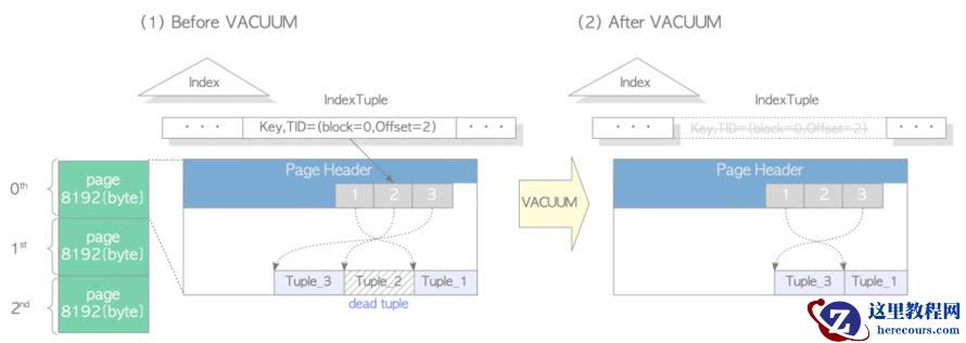 为此,PostgreSQL 会重排,将数据重新挪动,紧实碎片