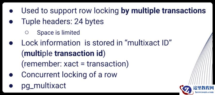 Used to support row locking by multiple transactions,之前我也写文章详细讲过其原理 深度剖析 MultiXactID,将一组事务 ID 记录到一个 MultiXactID 中,进行映射。