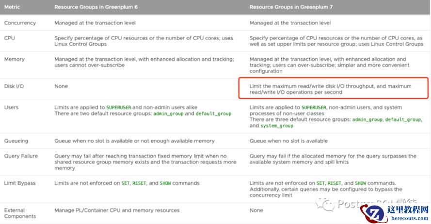 Greenplum Database introduces substantial improvements to resource group-based resource management, such as support for Linux Control Groups v2, simplified memory management, and support for disk I/O limits per resource group. 资源管理组可针对每一个组别单独设置其特定的CPU、内存和并发限制,提供数据库内部更加灵活和有效的资源管理手段,可以看到Greenplum7也支持了对IO进行限制。(Greenplum社区建议在CentOS 7.x系统中使用资源组管理资源能获得更好性能,如果是CentOS 6.x系统,则会导致明显的数据库性能下降现象,建议升级内核到 2.6.32-696或更高版本)。
