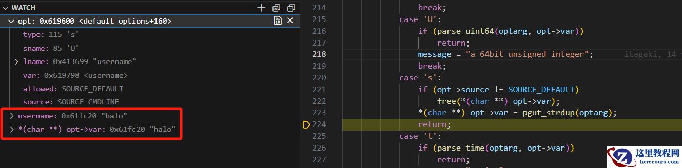 pgut_setopt函数再将对应的var的值 也就是对应的全局变量 username 的值 修改成传入的数据"halo",其他以此类推