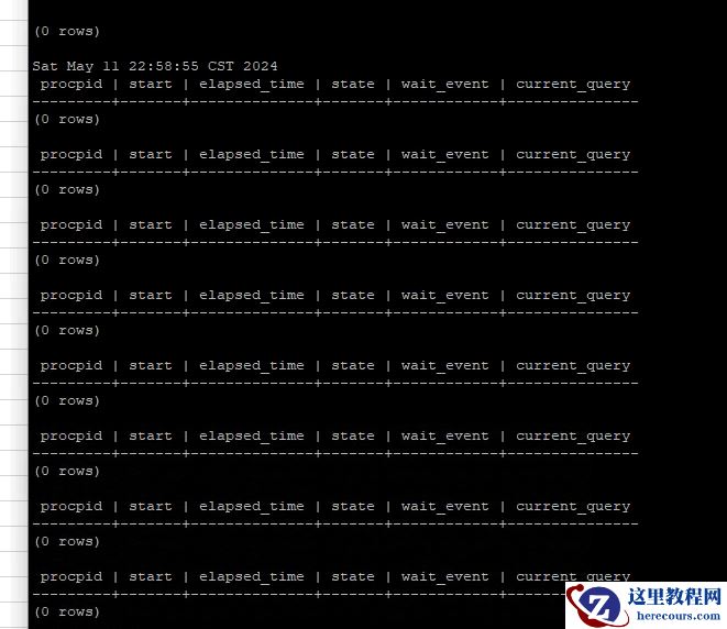 ```sql SELECT s.procpid, s.start, now() - s.start AS elapsed_time, a.state, a.wait_event, s.current_query FROM (SELECT backendid, pg_stat_get_backend_pid(S.backendid) AS procpid, pg_stat_get_backend_activity_start(S.backendid) AS start, pg_stat_get_backend_activity(S.backendid) AS current_query FROM (SELECT pg_stat_get_backend_idset() AS backendid) AS S ) AS s, pg_stat_activity a WHERE s.procpid=a.pid AND a.pid in( 29710, 29711, 29712, 29713, 29714, 29715, 29716, 29717, 29718, 29719 ); ```