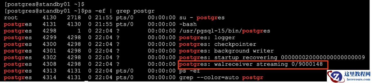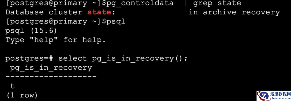 1、停止PG服务 [root@primary ~]# su - postgres [postgres@primary ~]$pg_ctl stop 2、以“postgres”用户创建创建standby.signal文件 touch /pgccc/pgdata/standby.signal 3、配置参数文件 cat >> $PGDATA/postgresql.conf <<"EOF" primary_conninfo = 'host=192.168.6.21 port=5432 user=repladm password=replica' EOF 4、启动PG服务 [root@primary ~]# su - postgres [postgres@primary ~]$ pg_ctl start